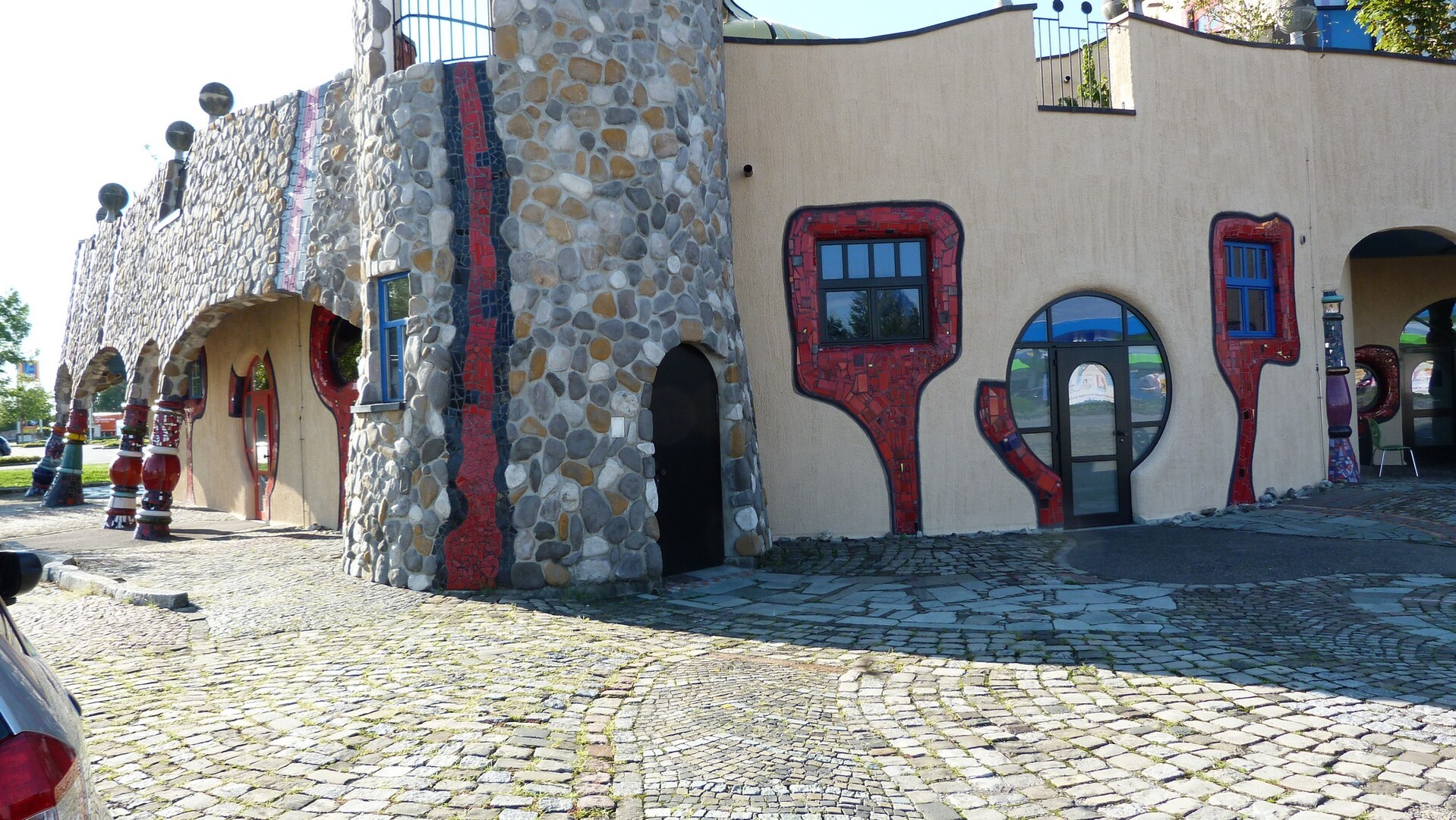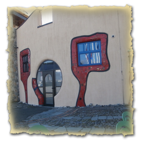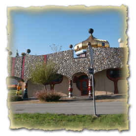 Das Hundertwasserhaus ist erbaut nach Ideen und Konzept von Friedensreich Hundertwasser. Es liegt unmittelbar am Kreisverkehr zum Flugplatz.